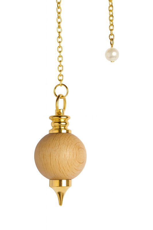 Buchenholz Kugel-Pendel mit vergoldeter Kette und Perlmutt Haltekugel.