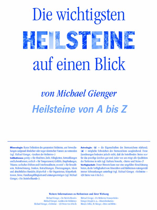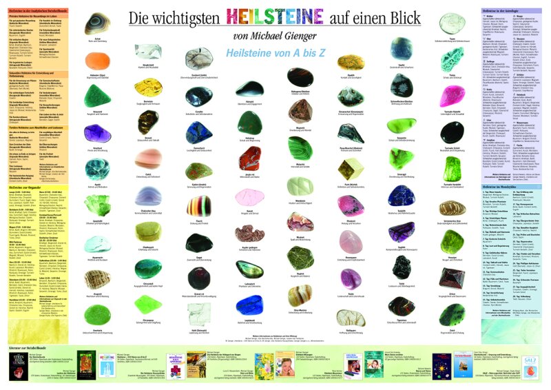 Auf diesem Poster sind die 64 gängigsten Heilsteine abgebildet und die Zuordnungen nach der Organuhr, nach den Tierkreiszeichen usw. aufgeführt.