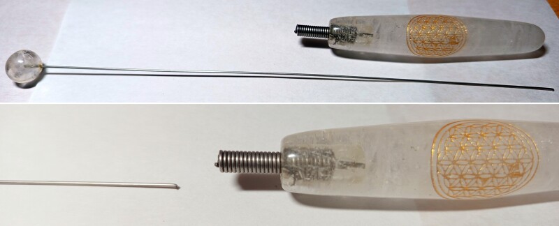 Diese Edelstein Einhandrute hat einen Griff und eine Kugel aus Bergkristall.