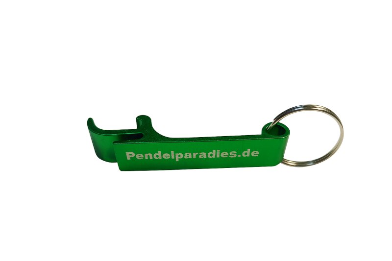 Mit der eingravierten Aufschrift „Pendelparadies.de“ ist der grüne Öffner zudem ein sympathisches Werbeobjekt – schlicht, praktisch und langlebig.