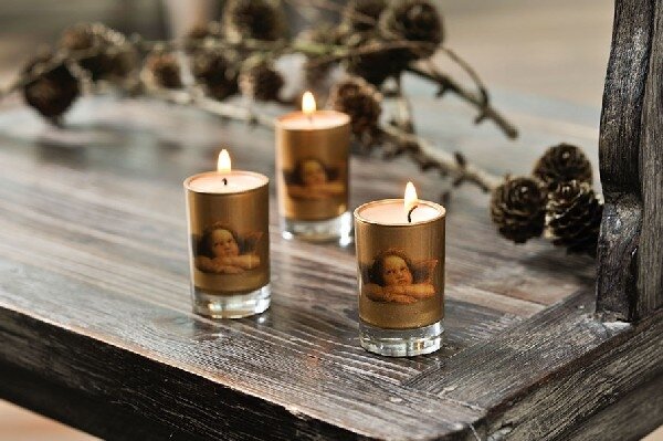 Tolle Kerze in dekorativem Glas, golden beschichtet.