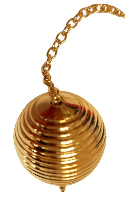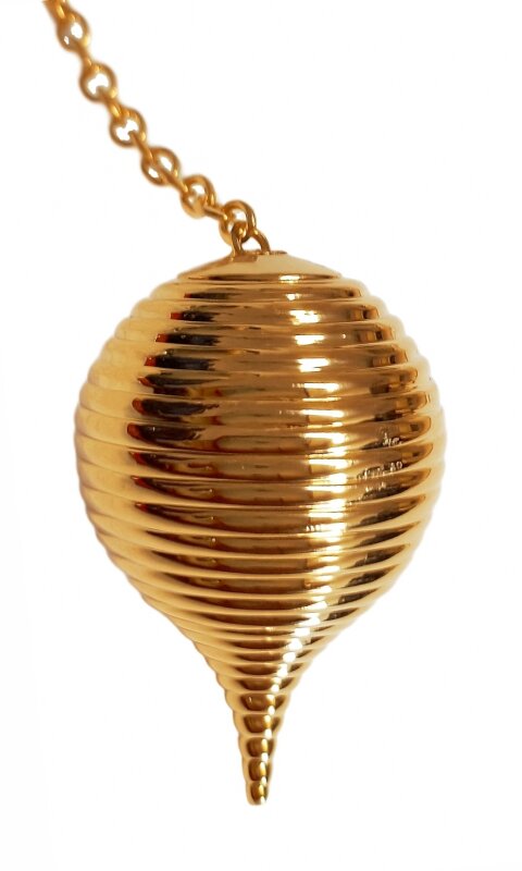 Dieses Pendel aus vergoldetem Messing beeindruckt durch seine spitz zulaufende Kugelform und die feinen Rillen, die die Oberfläche zieren.