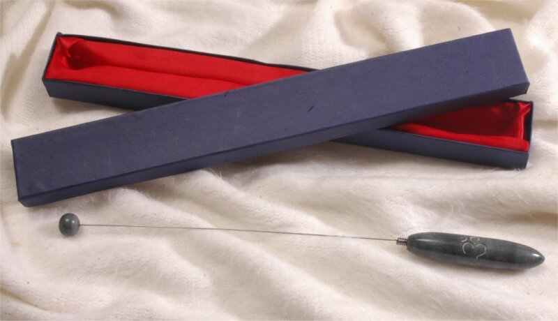 Einhandrute / Tensor mit Griff (ca. 7 cm lang) und Kugel aus Speckstein und graviertem OM-Symbol.