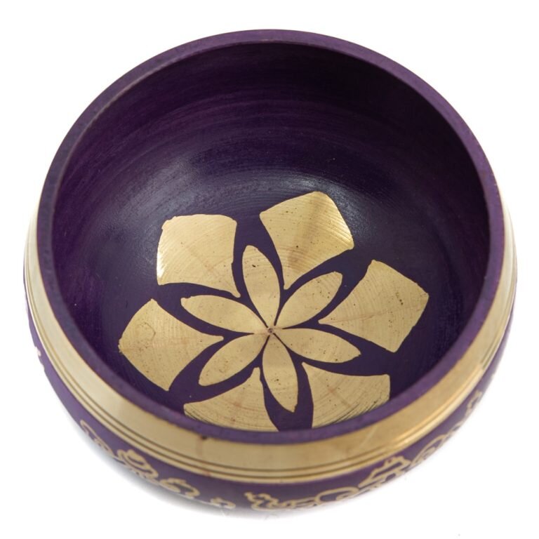 - eine handgefertigte Klangschale (Ø ca. 10 cm) in edlem Lila mit dekorativen Symbolen